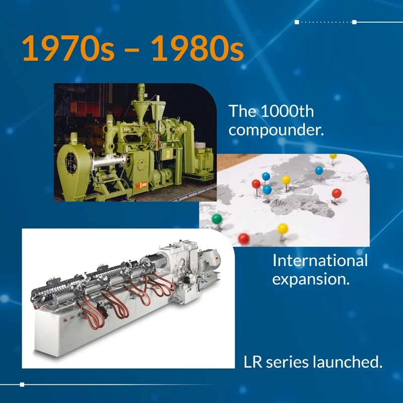 In 1945, BUSS filed the patent for a groundbreaking invention: the co-kneading principle, developed by Heinz List. This marked the beginning of what would become decades of compounding excellence.