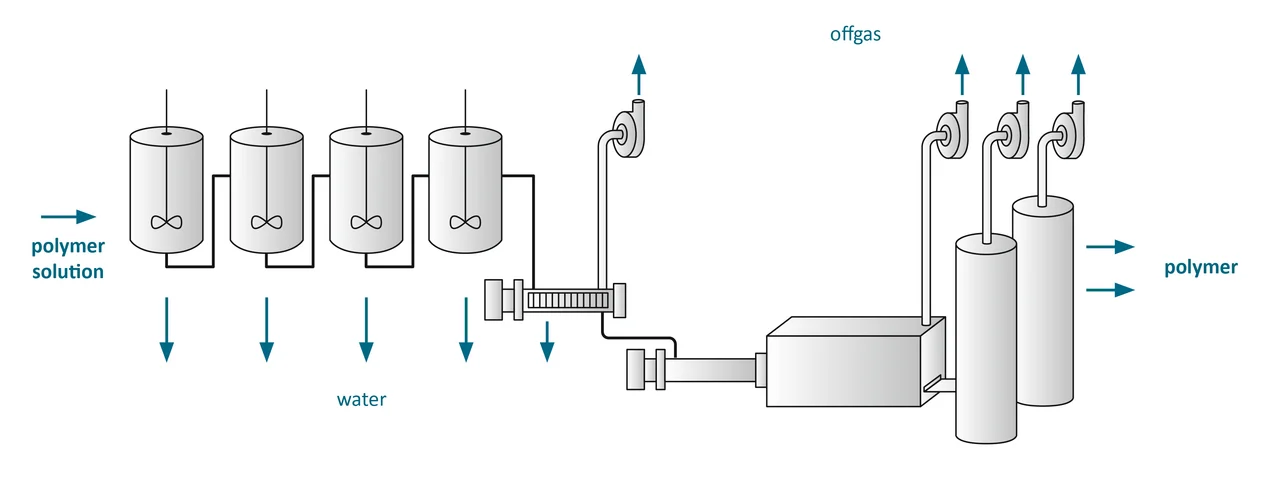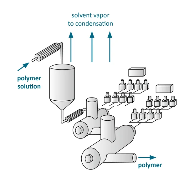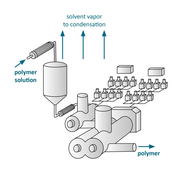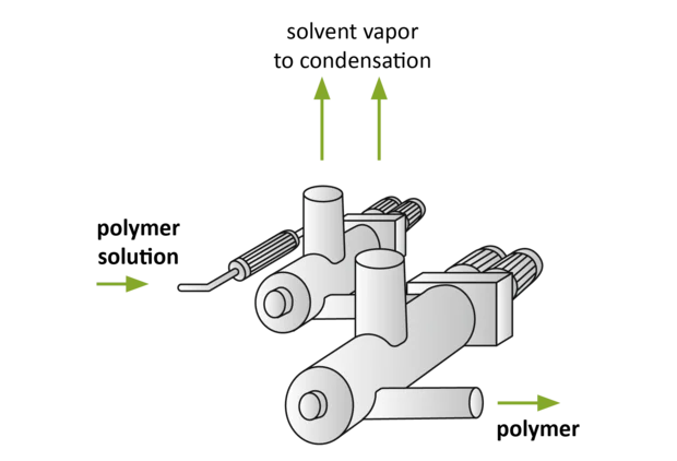 Bei der Elastomersynthese müssen die Lösungsmittel nach dem Polymerisationsschritt vom Polymer getrennt werden.