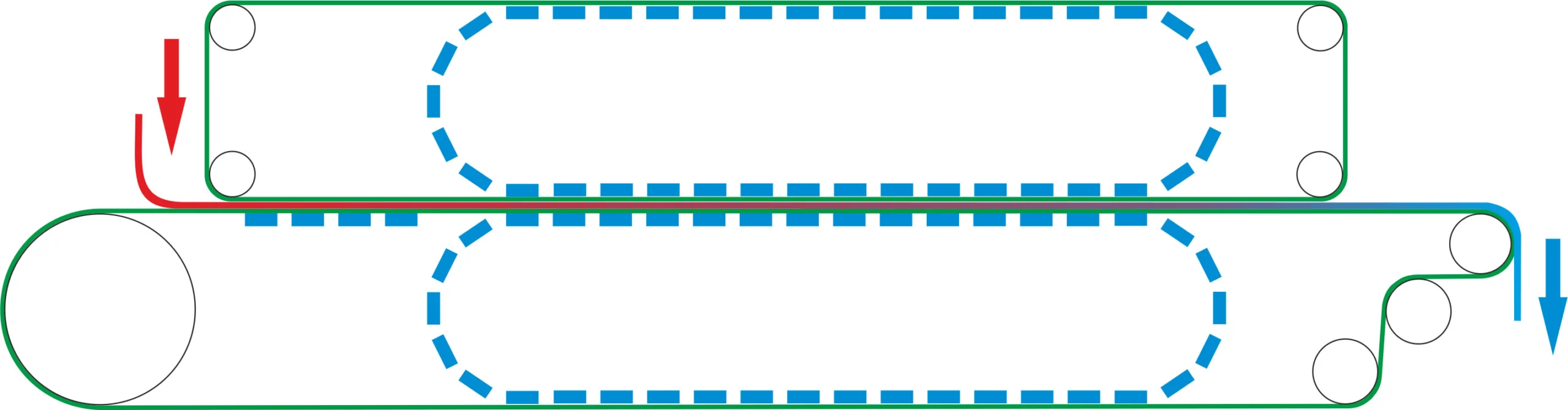 Der Raupenkühler der Bauweise CAT zeichnet sich dadurch aus, dass das zu kühlende Produkt mittels umlaufender Kühlplatten zwischen zwei Kunststoffbändern umschlossen und durch die Kühlstrecke transportiert wird.