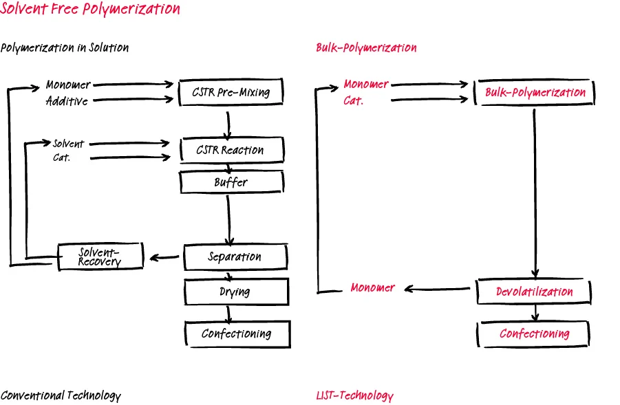 The first stage LIST KneaderReactor is used to polymerize the monomers and catalyts in a highly concentrated, solvent-free phase. Conversion rates of 90% … 99% can be easily reached.